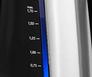 Cool detalje: Et blåt lys i vandniveauvinduerne viser, at der er tændt for elkedlen.